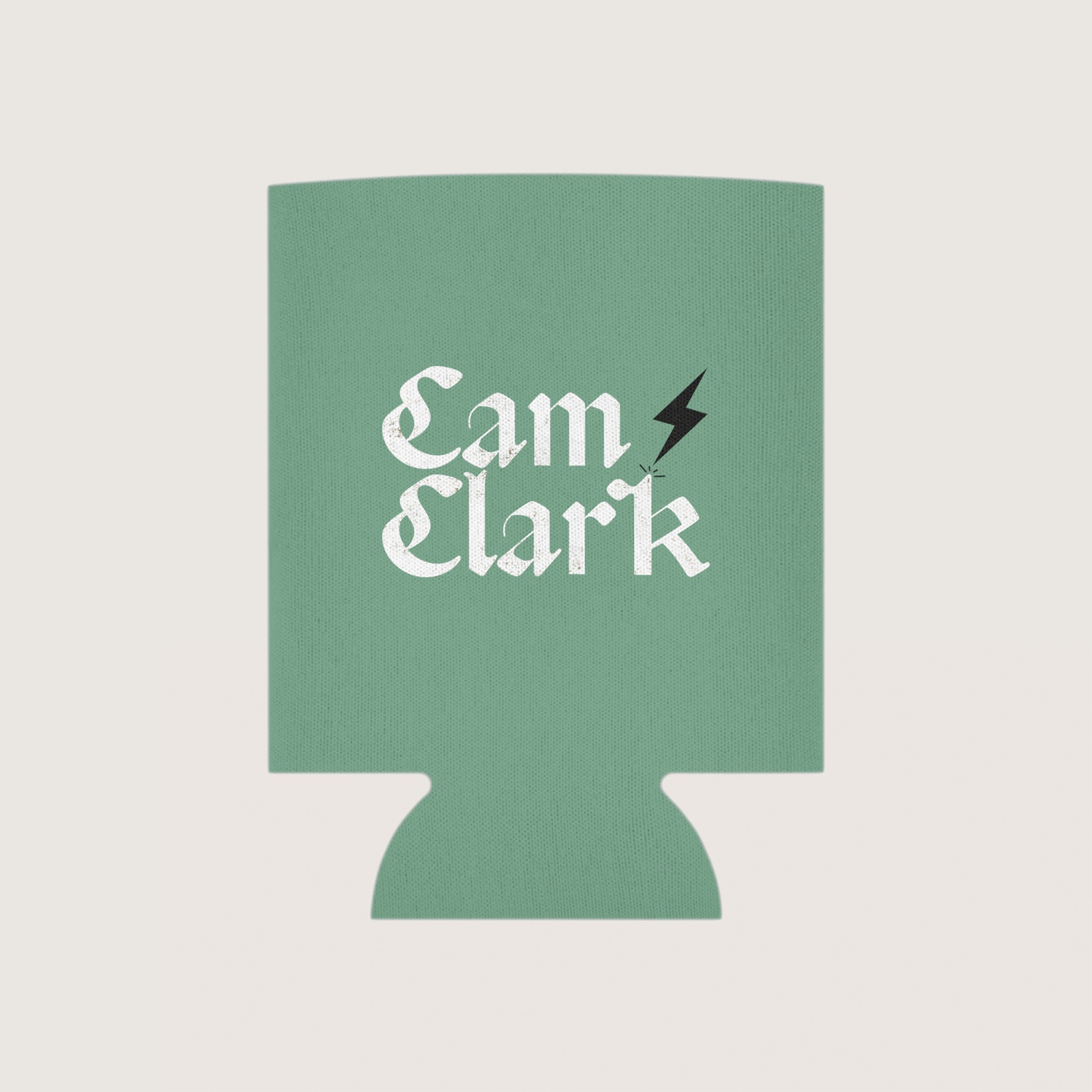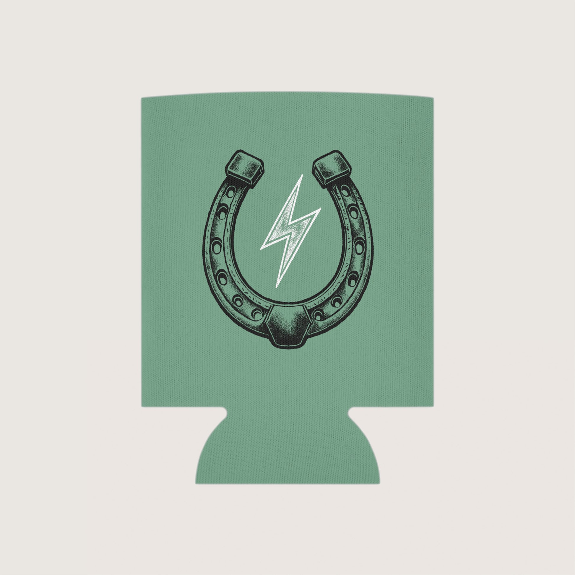 Horseshoe / Lightning Bolt and logo graphic featured on a seafoam can cooler.
